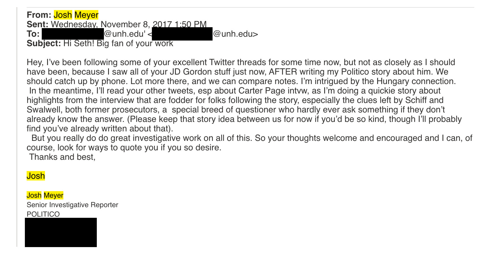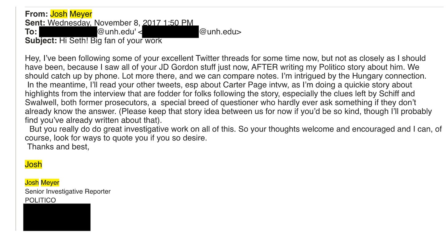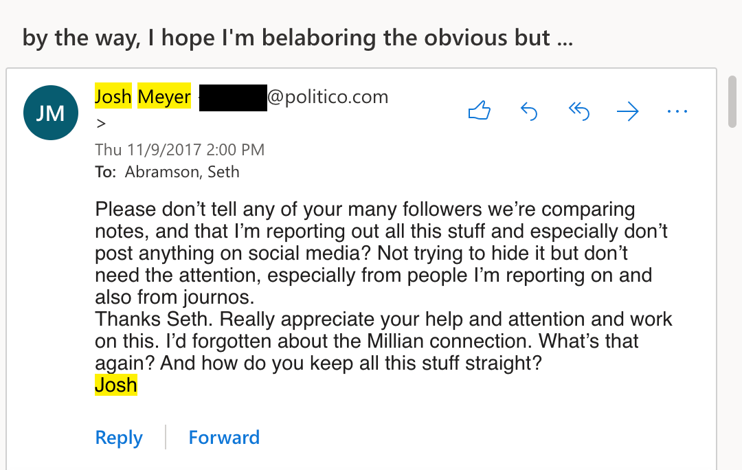 I wish I could say that this was the only lesson I learned about the deceitfulness of major media from Lyz Lenz and CJR. It wasn’t. Lenz’s coverage of my interactions with Josh Meyer of Politico was just as dishonest. Meyer and I first spoke by phone, at his request, in November 2017. He’d just sent me this startling email: