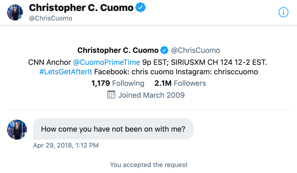 Cuomo first contacted me, out of the blue, on Twitter in April of 2018: