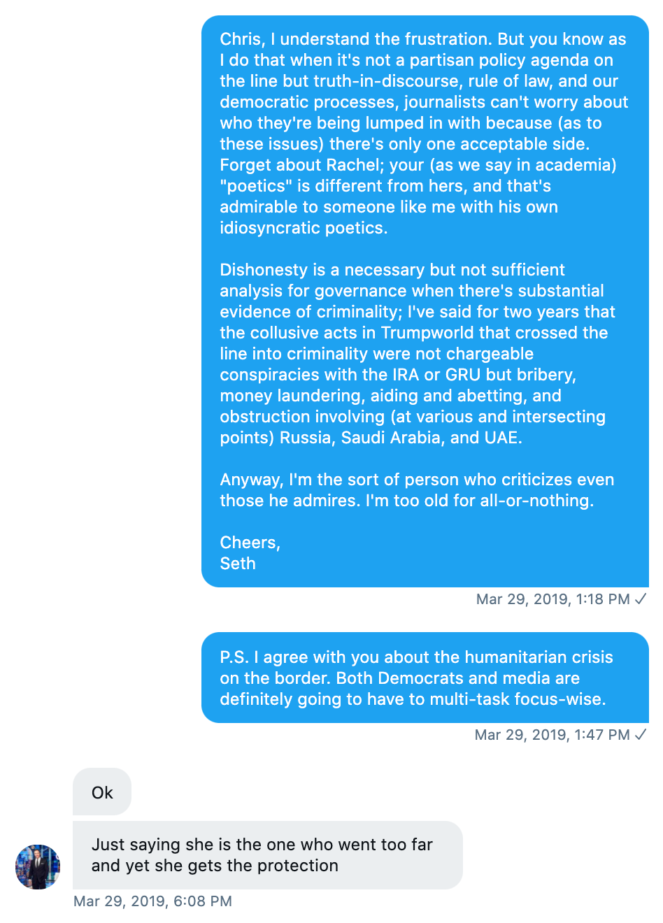 Did I think he sounded like a crybaby? Sure—but I also knew that I was in no position to judge, as despite having been enormously fortunate with my Twitter feed finding an audience whose size I never could have anticipated, I too fall into bouts of ridiculous self-pity. So I wasn’t entitled to “tsk” Chris for his, even if his level of success in the field of journalism (in every way one determines success) exceeded mine exponentially. You can see some of my self-pity in my response to Cuomo opining that, unlike him, Rachel Maddow had “protection” from sources inside the nation’s media apparatus: