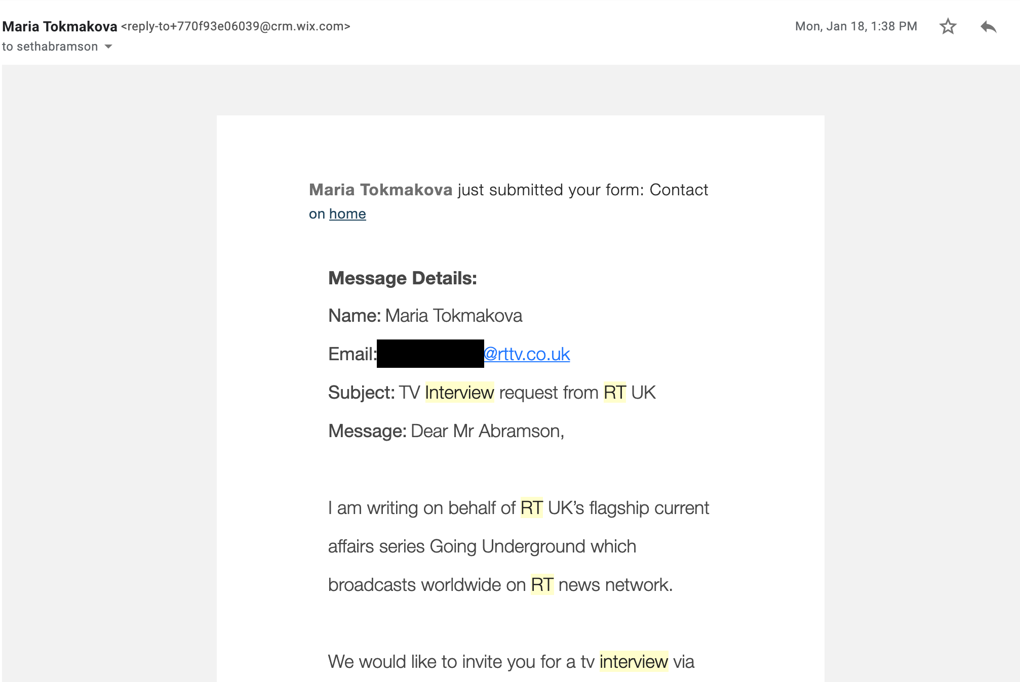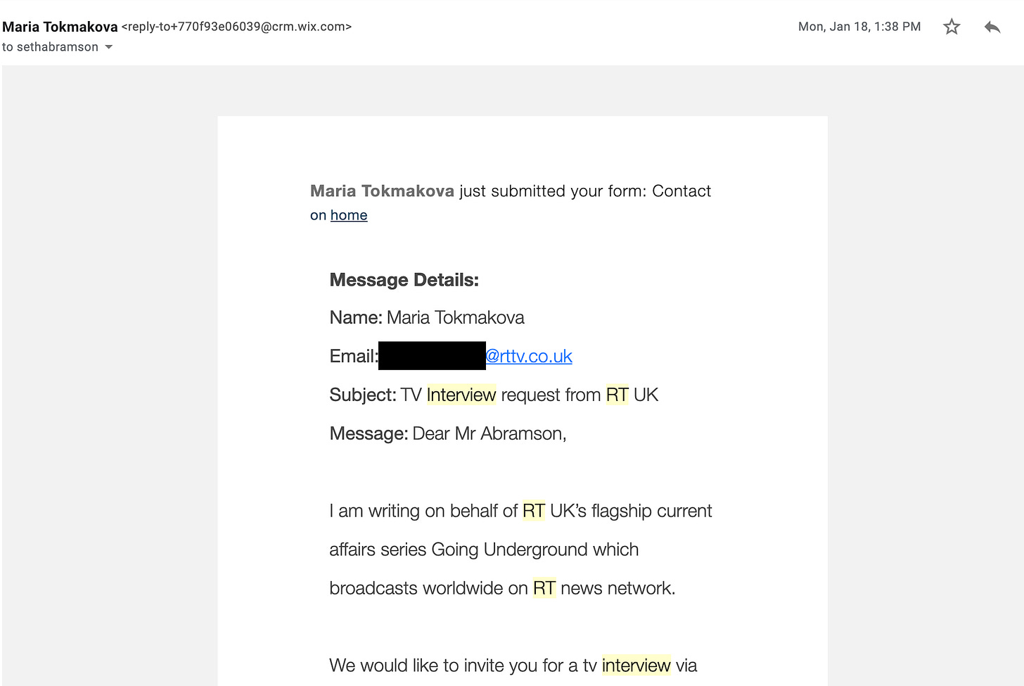 Because I have been a very public critic of Donald Trump since the middle of 2015, the Kremlin’s propaganda arm (Russia Today, popularly known and advertised as RT) has been obsessed with me for years now. Three times RT has tried to interview me—most recently, just a few weeks ago, in January—and three times I’ve declined the invitation, twice without sending any response and once by sending a brusque declination. Here’s their most recent approach, which I ignored: