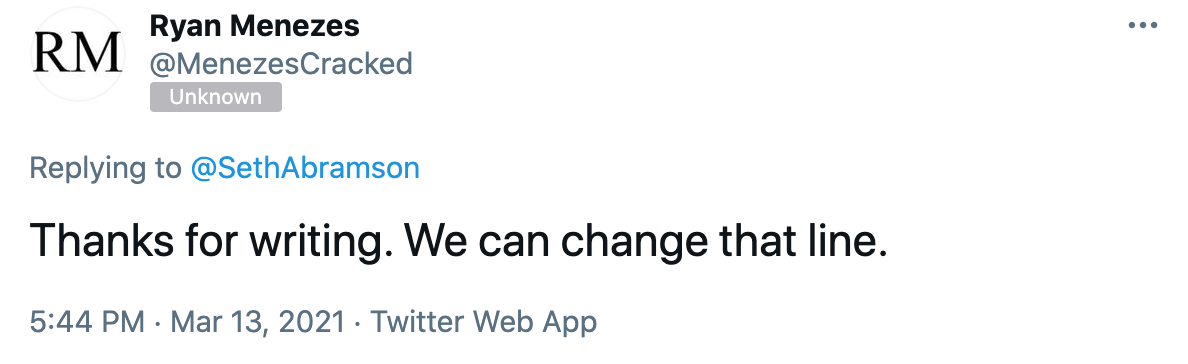 I sent Menezes a link to this essay series and told him—in strong terms—his article needed to be “fix[ed].” Here’s what he sent back, in a period of time not much longer than it would take to read the essay series to which I had just directed his attention: