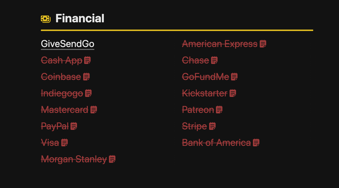 Trumpists also can’t use Substack, as the site’s third-party-payment vendor is Stripe—which is funded by now-cancelled U.S. seed money startup accelerator Y Combinator.