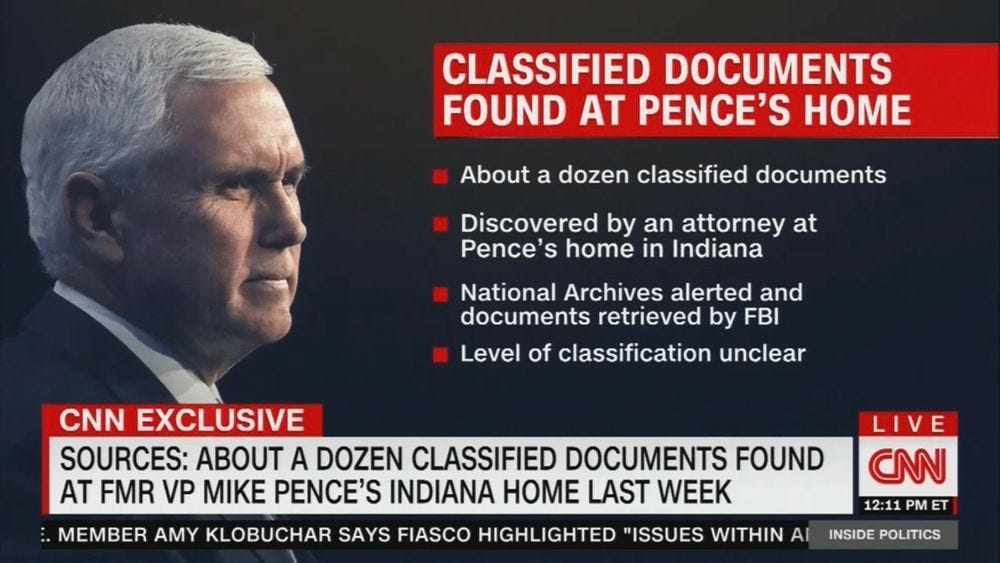 Less than two days after a breaking news report at Proof that reframed the document “scandal” currently plaguing Joe Biden as a problem with federal regulations dealing with NARA (the National Archives and Records Administration) and vice presidents in particular—an esoteric revelation that nevertheless could immediately aid Biden and his administration, as well as the Democratic Party, in distinguishing between the small number of sensitive and classified documents outgoing vice president Biden accidentally retained in 2017 from the more than sixty boxes of sensitive and classified documents premeditatedly stolen by outgoing president Donald Trump over a period of months in late 2020 and early 2021—the major breaking news today is that Vice President Mike Pence also had sensitive and classified documents in his possession after he left office in 2021.